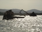 Ragazza in controluce al calar del sole relitto nei pressi di Tavolara (Sardegna)