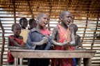 Un piccolo masai muove i primi passi, guidato dalla madre che lo protegge adombrandolo con le vesti.