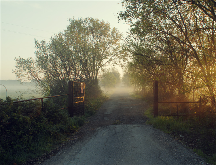 Come: L'autore ha usato un'ottica grandangolare con un'ampia profondità di campo, eseguendo un'inquadratura frontale, senza inclinazioni, ad altezza occhi, con una lieve angolazione verso il basso. Il tempo è immobile. La struttura del cancello appare perfettamente parallela ai lati del quadruccio e disposta in posizione quasi centrale all'immagine. La strada asfaltata è disposta anch'essa centralmente e si allontana in prospettiva verso il centro dell'immagine. La vegetazione ai lati della strada incornicia il percorso stradale guidando lo sguardo in questo campo lungo. Sullo sfondo è presente della foschia che rende indistinti e vaghi i contorni visivi dello spazio che recede donando un effetto di profondità. La luce è naturale, mattutina, e diffonde lateralmente dalla destra del fotogramma, filtrata dagli alberi lungo la strada: una luce morbida e calda che viene ad organizzare lo spazio visivo, rendendo bene i volumi e concentrando l'attenzione percettiva su quella nebbia in lontananza e sui contorni vaghi dello sfondo. La distribuzione dei gradienti di luce unita ai valori della sua temperatura colore, da caldo a freddo, potenzia la sensazione di tridimensionalità dell'immagine già esaltata dalla visione atmosferica, donando una sensazione di vaghezza e magia.