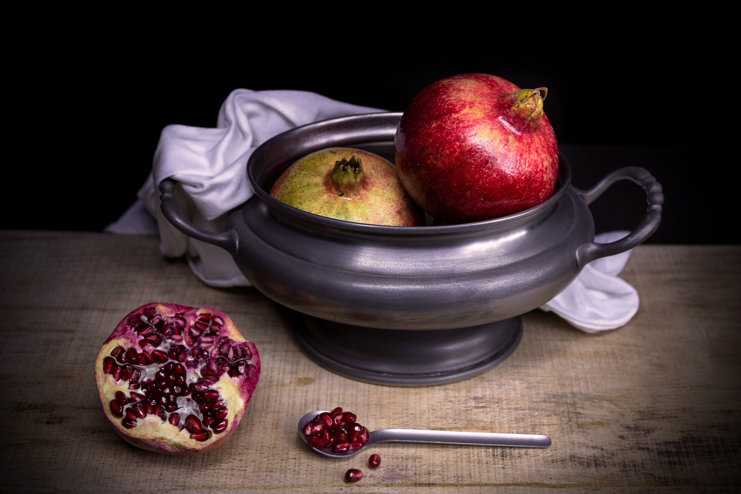 Il drappo non lo vedo a fuoco come si crede, basta guardare la parte terminale del tavolo, così come i primi granelli di melograno sul tavolo, prima del cucchiaino, leggermente sfuocati.