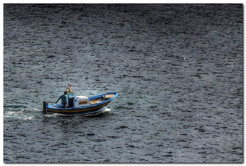Semplice ed essenziale. Qualità rare in una fotografia. Azzeccati i colori, bello il mare quasi grigio-nero. Bello anche il digradare nella parte alta del fotogramma.