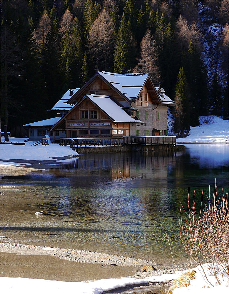 Sarebbe stato interessante arretrare il punto di ripresa per dare una panoramica più ampia di lago e monti alle spalle (magari indietreggiando in modo da avere pure la passerella in legno sul fiumiciattolo inclusa nel paesaggio (certo avresti dovuto andare a camminare in mezzo alla neve e con il terreno piuttosto morbido/fangoso sotto i piedi).
