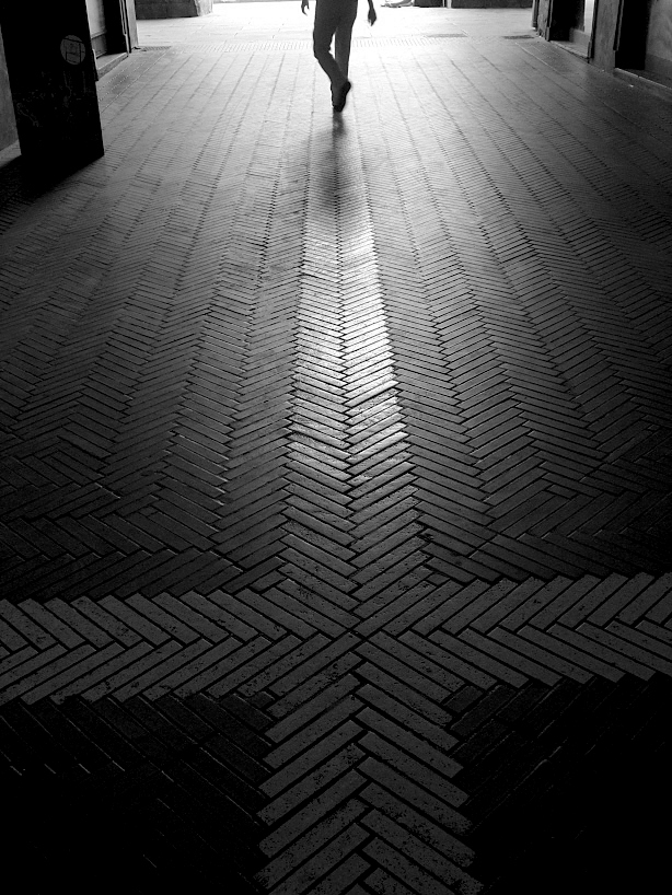 Bel momento colto, l'uomo è perfetto in quella posizione del frame. Il b/n era d'obbligo e lo hai reso a mio avviso corretto. Sai che la proverei clonando le.mani?! Cosi...giusto come sfizio, per capire che effetto fa.