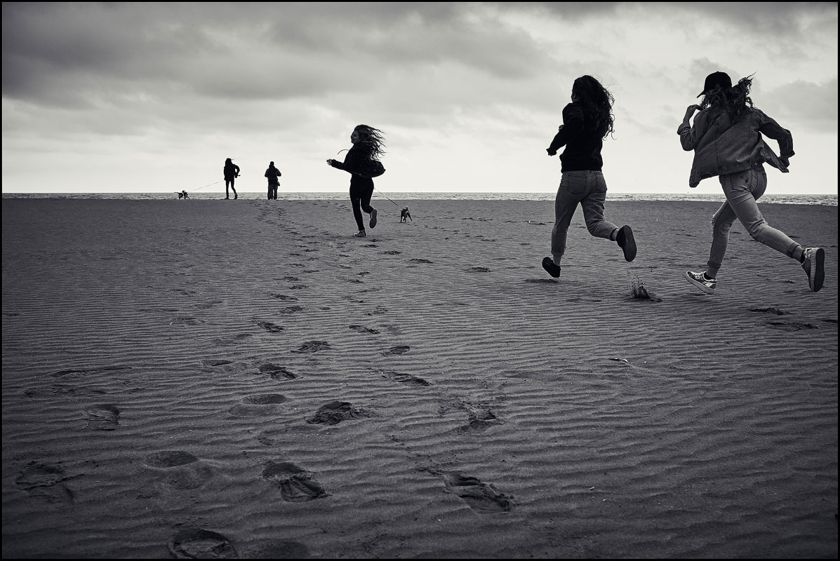 Corriamo insieme a queste ragazze. Il movimento accompagna lo sguardo, che può percepire il senso di fuga. Una fuga però intima, grazie alla scelta di tenere a freno le tonalità alte (scelta che in un primo momento non ho condiviso). Proprio la penombra è quel fattore in più che rende il frame suggestivo e - appunto - intimista -. Laddove una maggiore solarità avrebbe enfatizzato gli elementi (sabbia - luce - aria - mare) togliendo quel sapore che ho anzidetto.