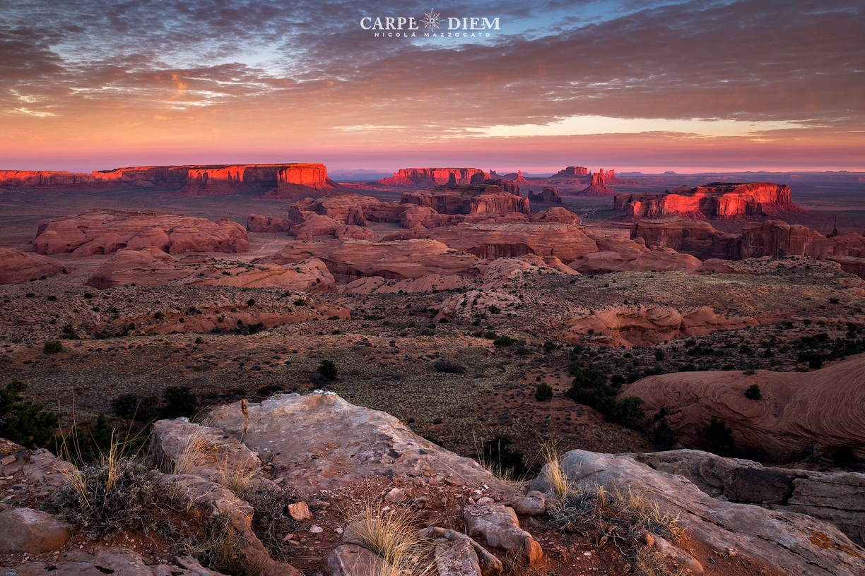 La Monument valley che saluta un nuovo giorno baciata dal primo raggio, mentre le nuvole pian piano si diradano...