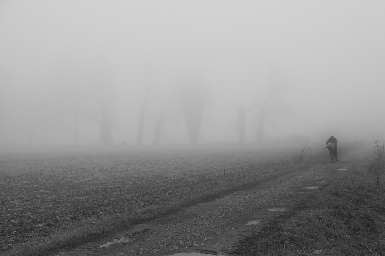 Forse avrei aspettato che si avvicinasse un pochino di più il signore in bicicletta, mentre sta percorrendo questa stradina di campagna in tutta tranquillità tra la nebbia.. Piacevole composizione. Ciao