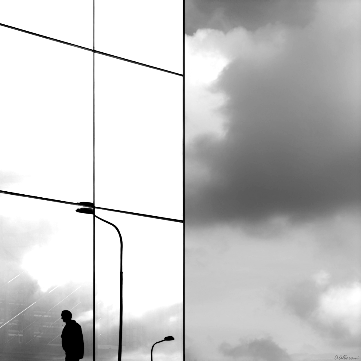 Ci credi, appena ho visto questa proposta ho pensato a due foto diverse, un dittico e sono partito a cercare connessioni fra le due immagini, magari un qualcosa di concettuale. e invece non avevo capito una beata fava…ci sono arrivato dopo qualche istante. Scena riflessa in una parete vetrata ma non semplicemente specchiata pari pari ma colta in un momento cromaticamente e strutturalmente diverso. Ne deriva una porzione specchiata chiara dove risaltano la figura umana ed i due lampioni. Contrapposizione netta specchi e cielo nuvoloso. E poi esecuzione impeccabile e pulita. Bella.