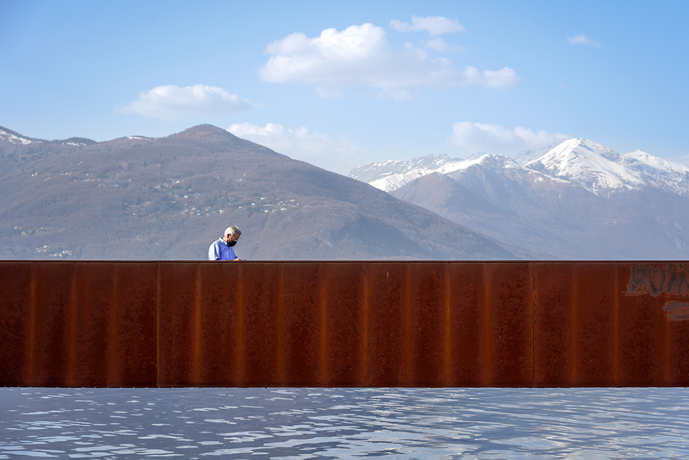Un sapiente uso dell’obiettivo ha appiattito l’immagine creando un effetto davvero particolare… Una ripresa originalissima, che mi piace molto anche per le tonalità chiare di acqua-monti-cielo interrotte dal ruggine intenso della struttura… L’uomo dimensiona e contestualizza. Molto interessante
