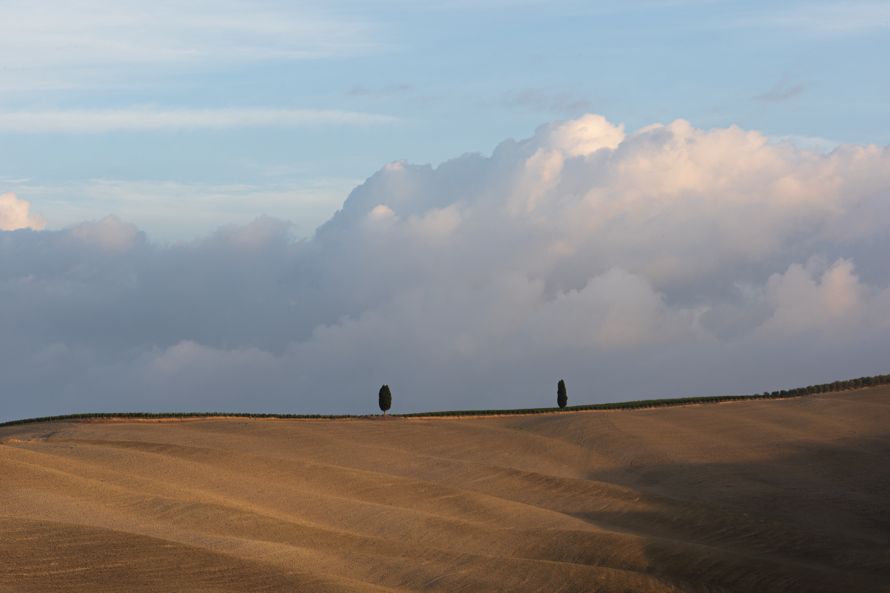 Luogo incantevole, nuvole corpose e l'accoppiata di cipressi sulla sommità della collina...