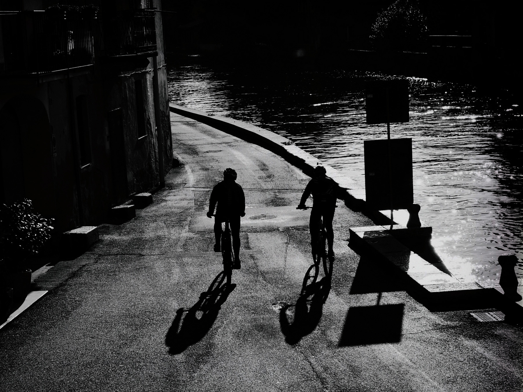B/n deciso che mette in risalto le ombre dei ciclisti.