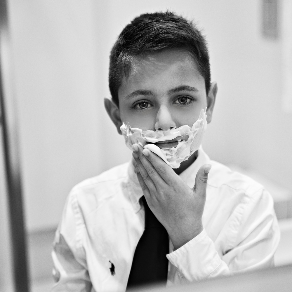 Molto bella, un ometto che assapora per gioco il gesto della rasatura che da grande diventa una scocciatura