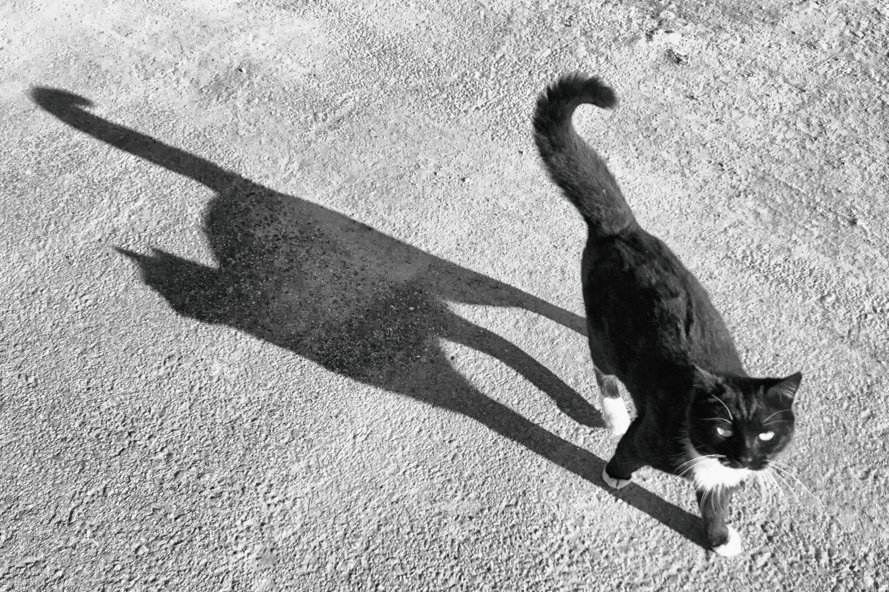 Un grazioso micio con la tipica espressione felina a metà tra il tenero e lo strafottente, assolutamente perfetta l'ombra lunga e delineata, quasi meglio del gatto stesso