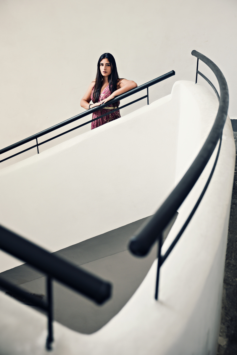 Il vivace dinamismo degli elementi grafici curvi dei corrimano trova quiete laddove è posizionata la protagonista del tuo scatto, rendendo quell'area una specie di porto sicuro.