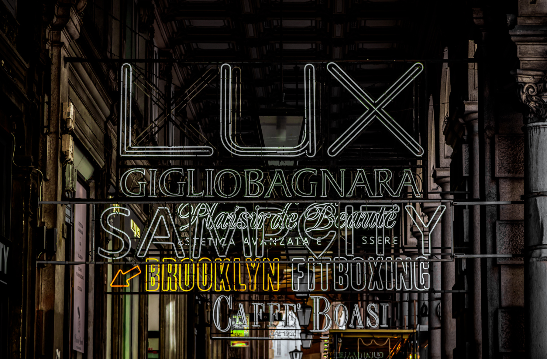 Bel susseguirsi di insegne, sapientemente schiacciate dal teleobiettivo, in un’affascinante atmosfera vagamente dark Mi piace