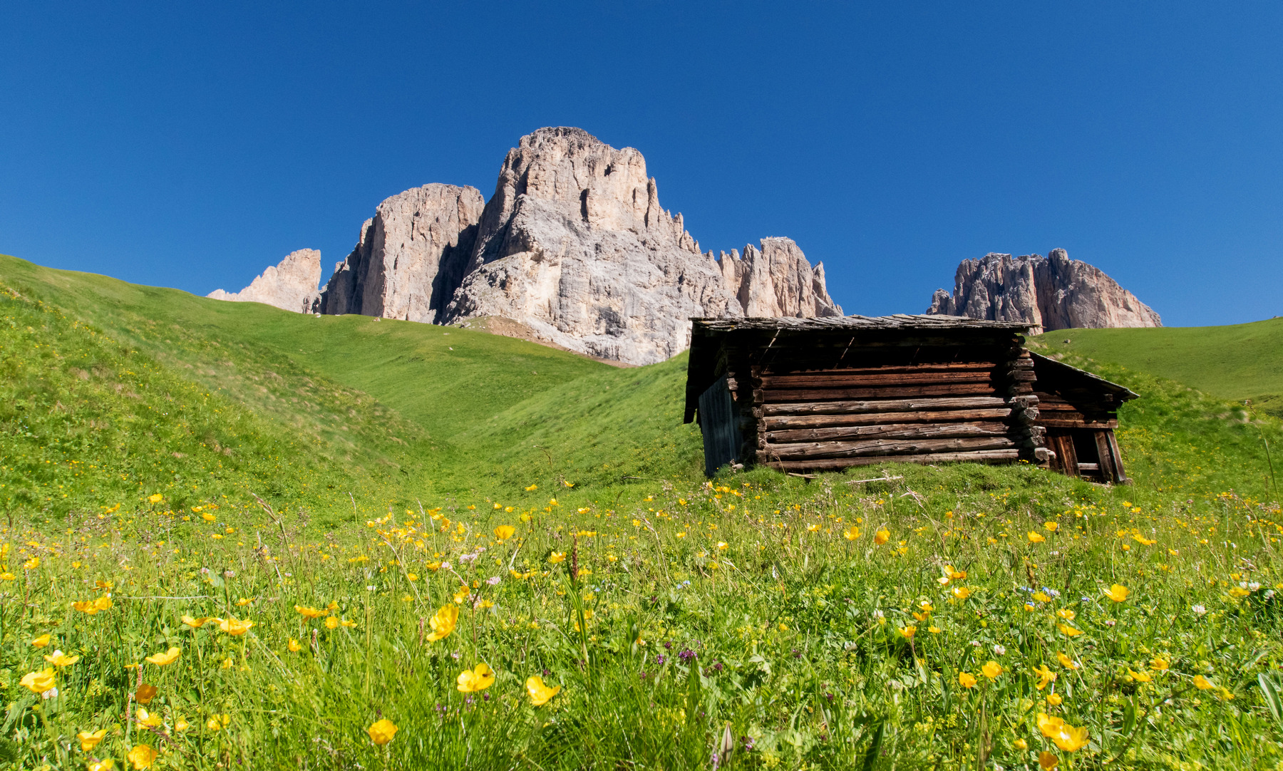 Precoce estate per questi luminosi alti pascoli dolomitici in questa immagine che sinteticamente li racconta. Il tabià ci dice della attività di fienagione, le pareti dolomitiche si mostrano nella loro possenza di montagne coralline gialle arancio grigie che decollano severe da questi accoglienti ambienti prativi. Patrimonio dell'umanità. Bellissima e paradigmatica immagine dolomitica. Ciao, Francesco _________________ Fotocamere Olympus OMD e PEN, Panasonic G3. Software GIMP