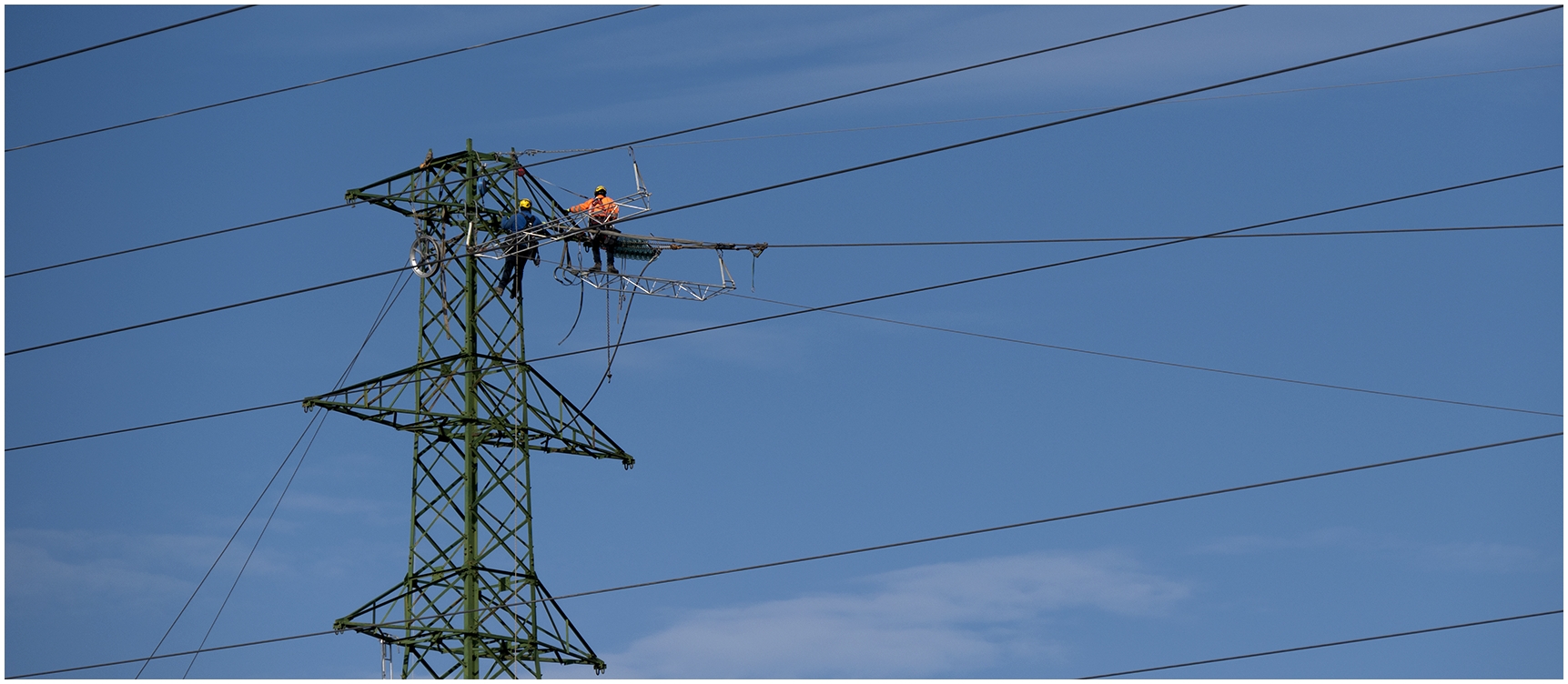 Già bella per l’intrico di fili e l’ottimo posizionamento del traliccio nel formato panoramico (persino le chiusure negli angoli!), si arricchisce della sorprendente presenza degli uomini che operano disinvolti… Una bella immagine e una valida testimonianza, complimenti!