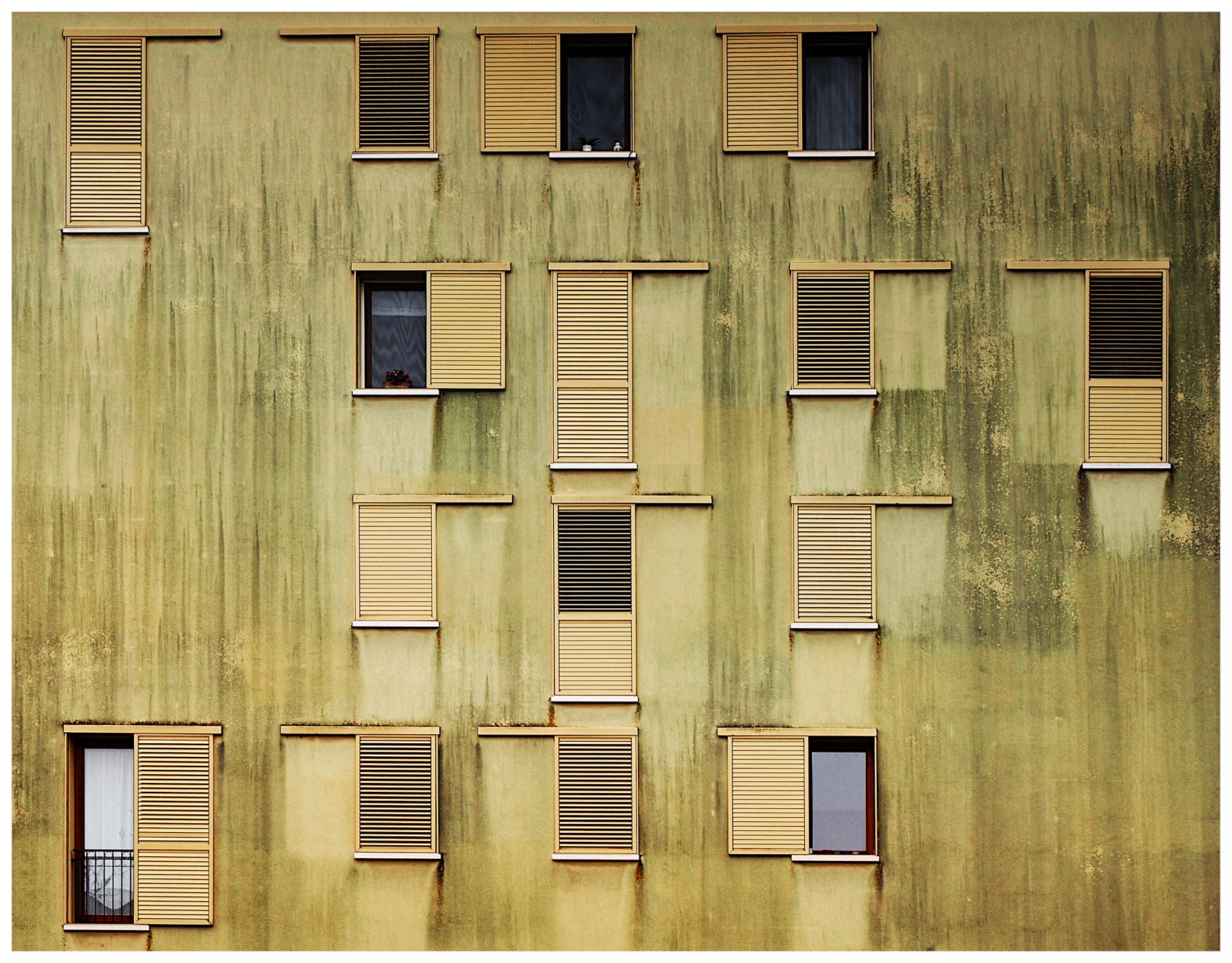 Le persiane tutte diverse danno ritmo, ma è proprio lo sporco, le macchie e quel verde consumato che rendono la foto speciale.