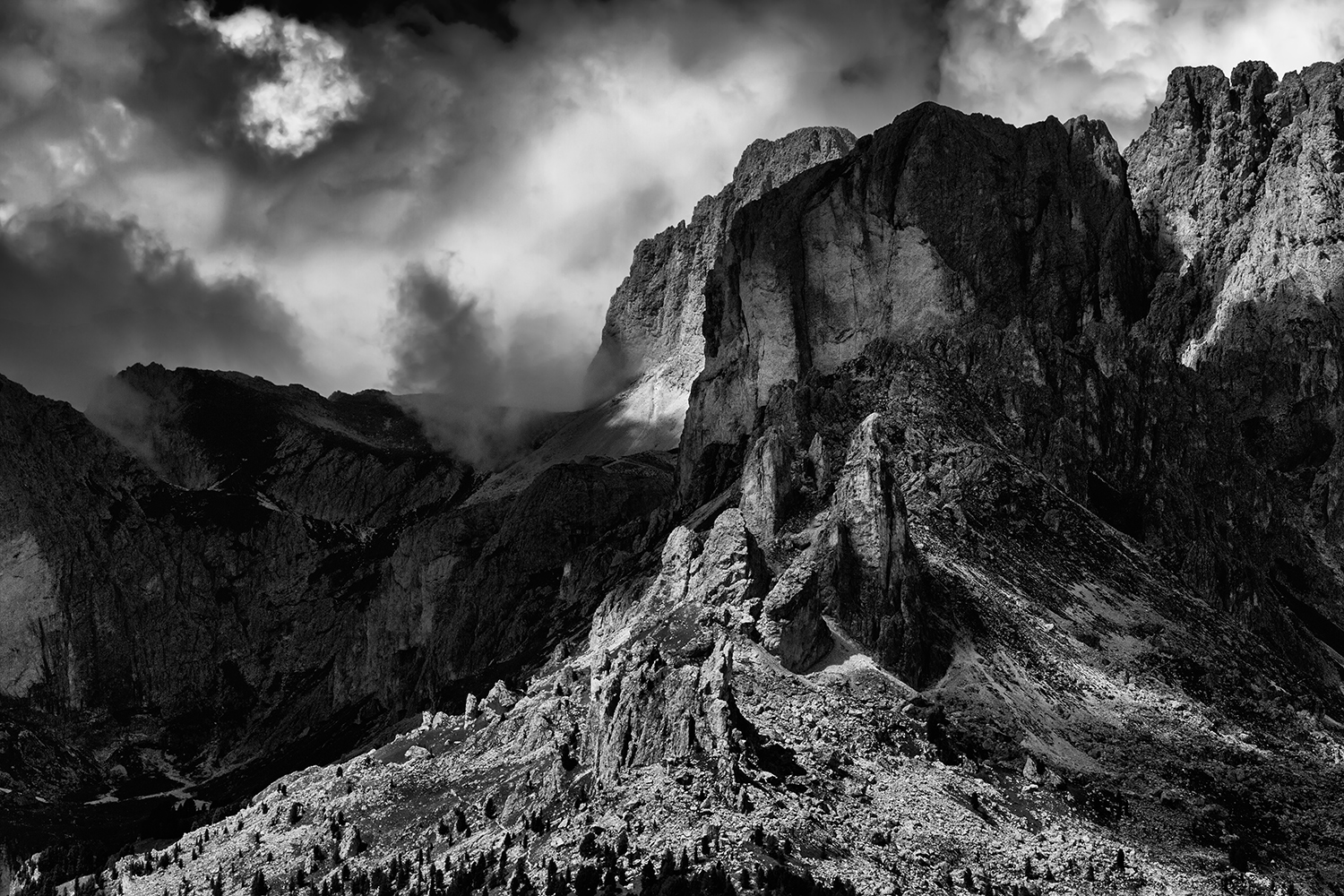 Un bel paesaggio dolomitico, ben drammatizzato dal bn dai forti contrasti