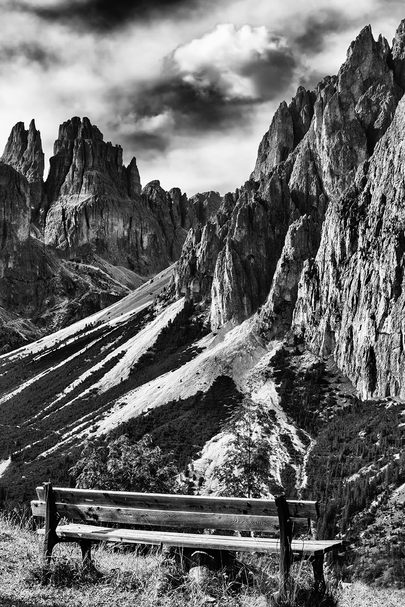 La dolce e amena panchina contrasta con la possenza delle crode dolomitiche del Catinaccio, che si frastagliano nel consueto cielo drammatico. Bellissima fotografia,. Ciao, Francesco _________________ Fotocamere Olympus OMD e PEN, Panasonic G3. Software GIMP