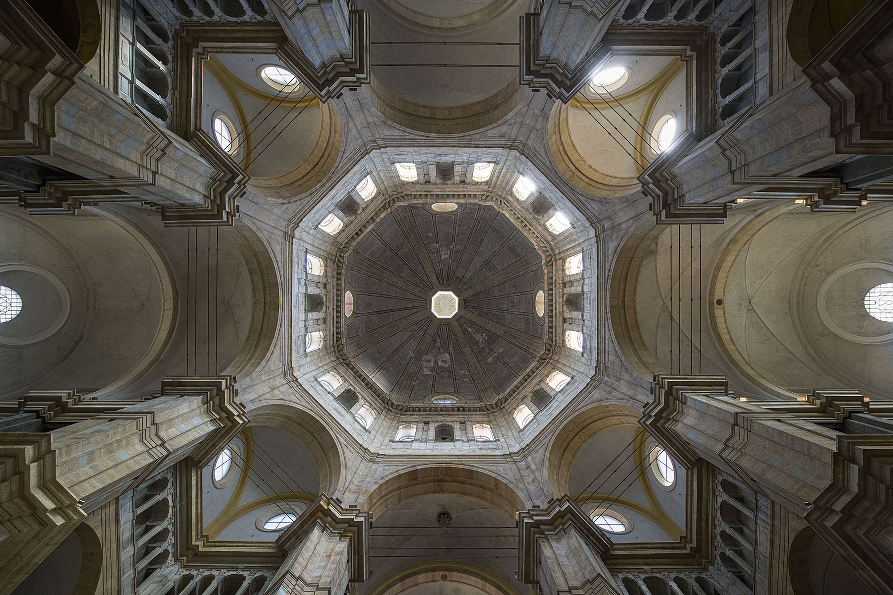 ​La luce che filtra da finestre circolari e ovali, distribuite in modo simmetrico, crea un gioco di chiaroscuro che scolpisce le superfici e accentua la profondità degli elementi strutturali. Ciao Gianni