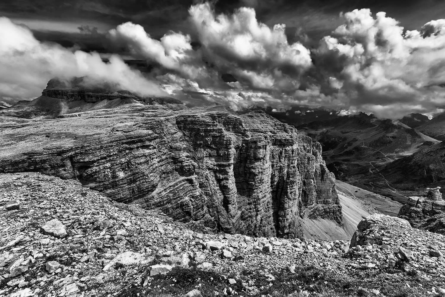Ripresa questa volta fatta direttamente in mezzo alla dolomia, probabilmente proprio in cima al Sasso Pordoi. Queste stratificazioni rocciose del Gruppo del Sella sono estremamente caratteristiche a testimonianza palese della origine geologica di queste montagne. Il tuo consueto linguaggio fotografico è per me sempre apprezzabile, le bonarie nubi estive diurne su cielo quasi nero sono un condimento che mi piace sempre molto. Ciao, Francesco _________________ Fotocamere Olympus OMD e PEN, Panasonic G3. Software GIMP