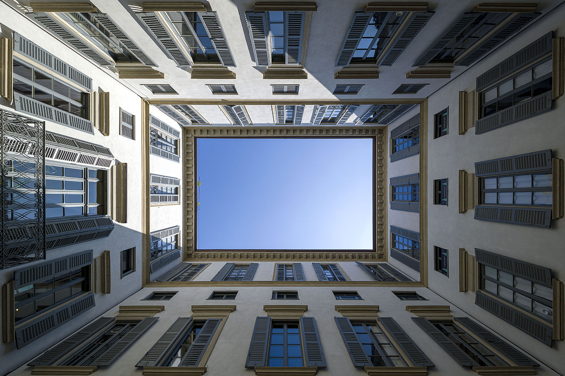 | La foto che è scattata dal basso, crea un effetto molto drammatico e geometrico. Geometria Impeccabile: Le linee delle finestre e delle pareti convergono verso il centro, incorniciando perfettamente il rettangolo blu del cielo.....una lezione di simmetria e punto di fuga.Ciao Gianni. |