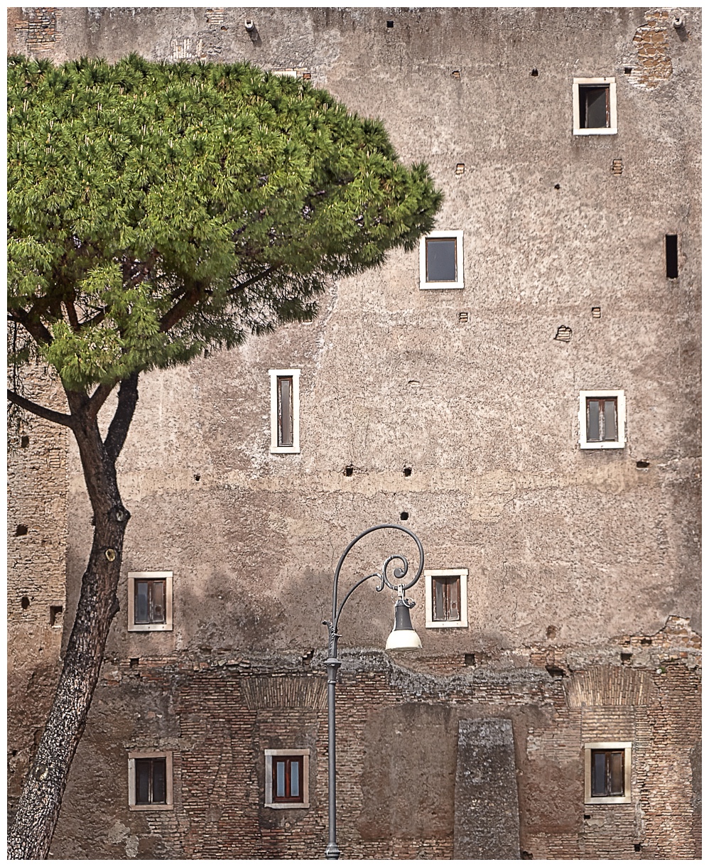 La composizione è geometrica, equilibrata, con il pino che bilancia l'effetto visivo delle finestre.