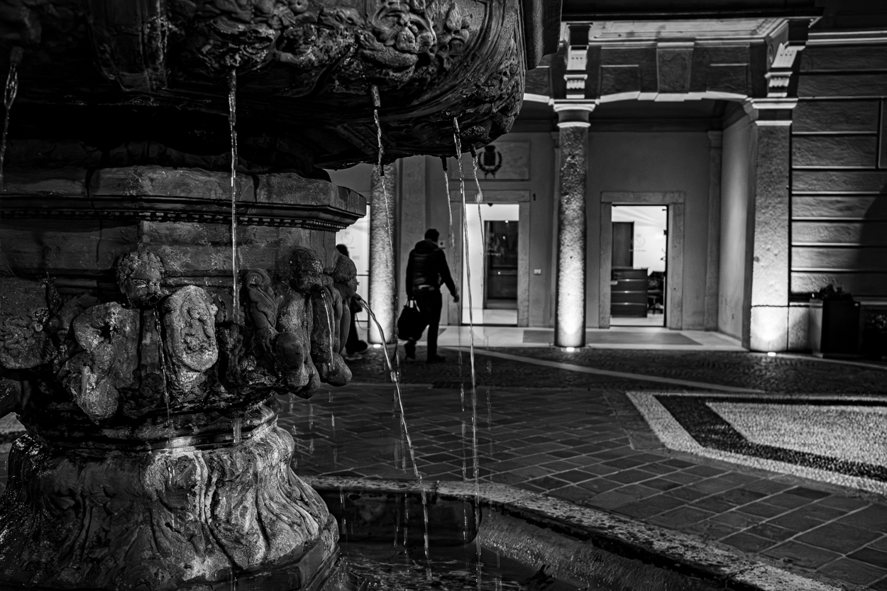 La fontana fa da cornice alla persona un po misteriosa che si accinge a varcare la porta fornendo profondità allo scatto.