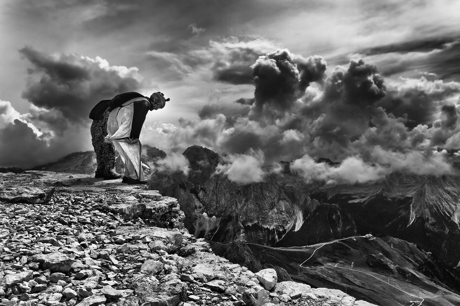 un attimo spettacolare, questo uomini pippistrello sono davvero dei "pazzi" nel senso uono ovviamente, ottima ripresa prima del salto e come sempre un lb/n da paura, bravissimo.