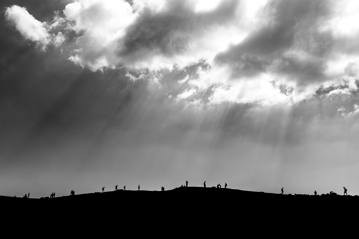 Un cielo drammatico, dalle cui nuvole filtrano possenti raggi di luci, incombe sul profilo collinare dove si trovano disposte tante figure umane. E' una scena che colpisce.