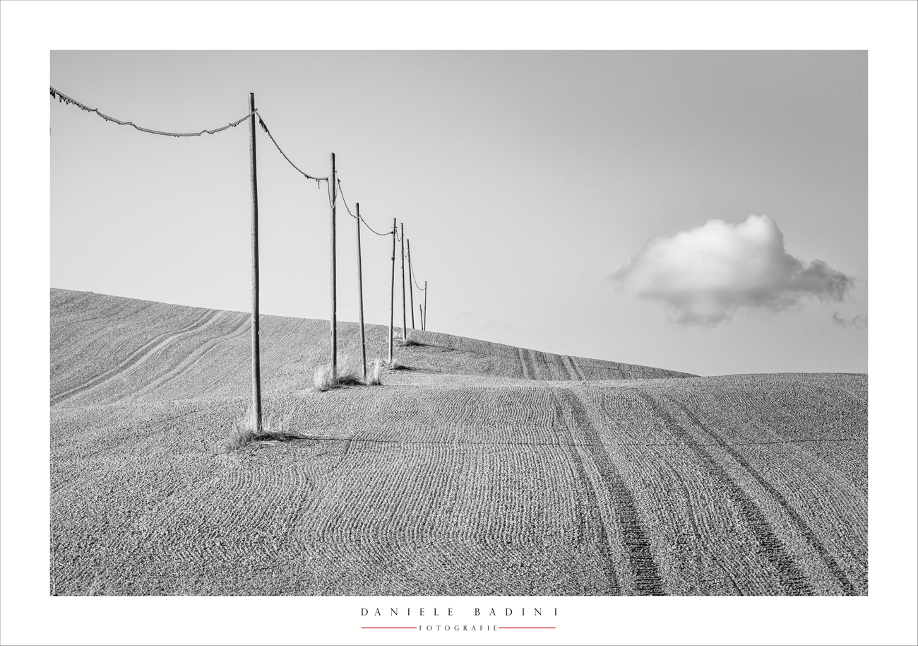 L'elemento più forte di questa immagine è la ripetizione seriale dei pali della luce che si estende verso l'orizzonte. Queste linee verticali creano un forte senso di profondità e direzionalità, guidando lo sguardo dell'osservatore. È un esempio classico di come le linee possano diventare il soggetto principale in assenza di colore. La nuvoletta poi è la ciliegina sulla torta. Ciao Gianni.