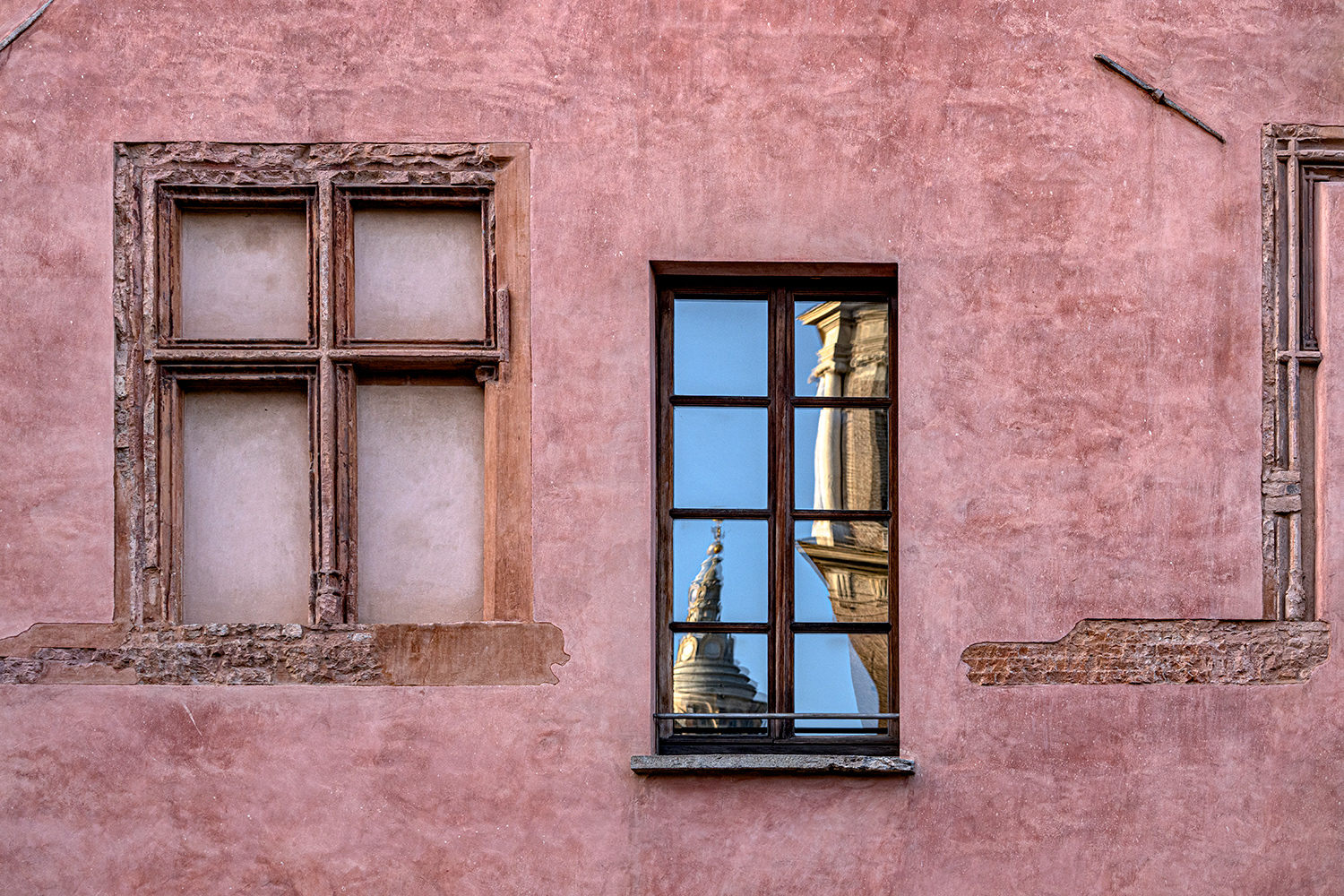 Una bella composizione con il riflesso sulla finestra centrale che diventa il fulcro dell'immagine.