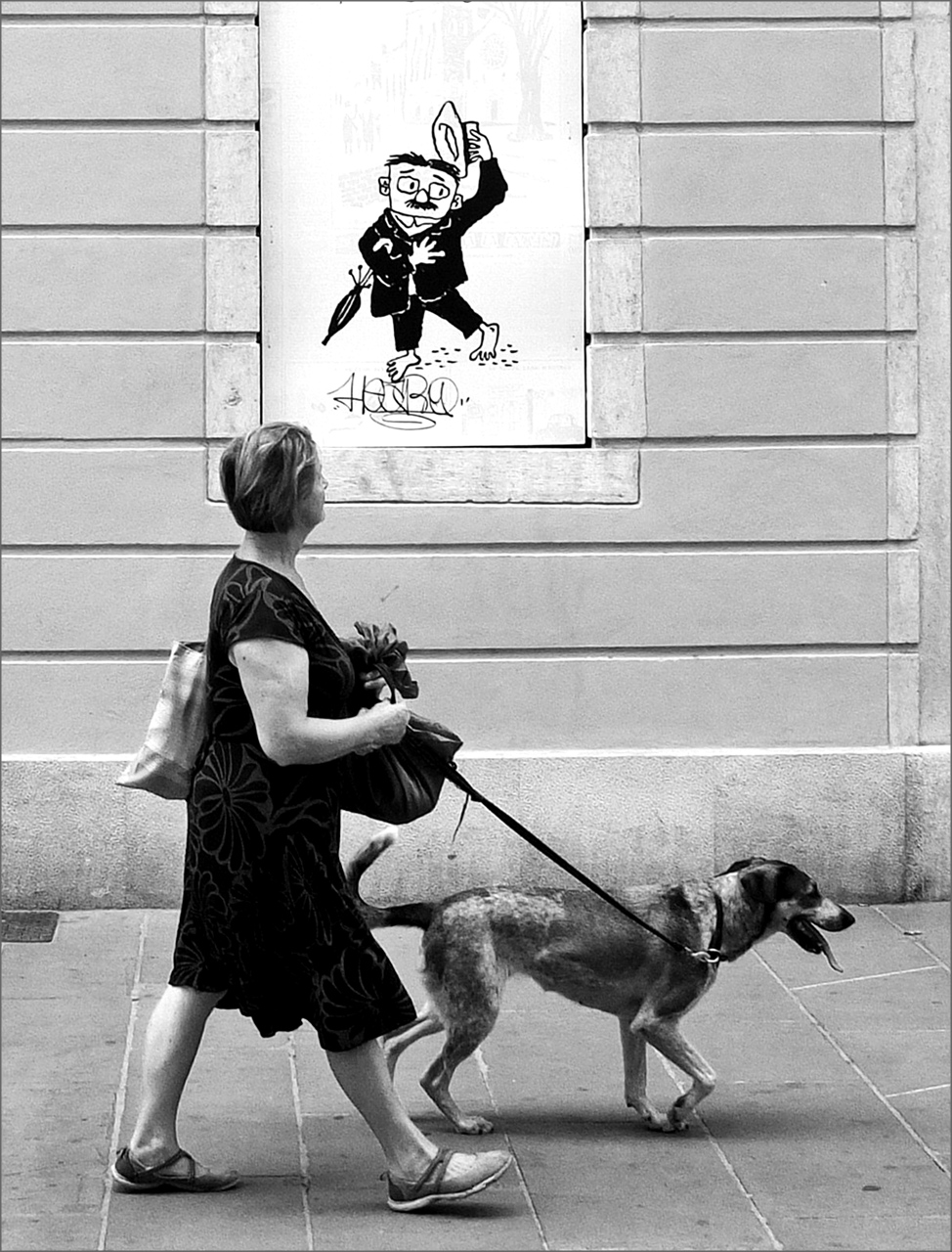 Ottima la traduzione in bianconero e il momento colto che si esprime nel rapporto tra la signora con il cane e il murales. Tutti i protagonisti sono colti con le gambe in movimento che ne fanno uno scatto anche dinamico.