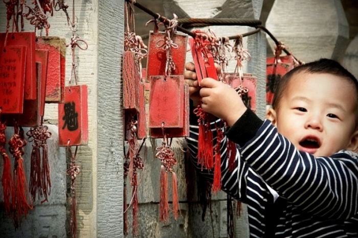 Il contesto è un tempio confuciano in Cina e i cartellini rossi sono il corrispondente cinese dei nostri "ex voto".