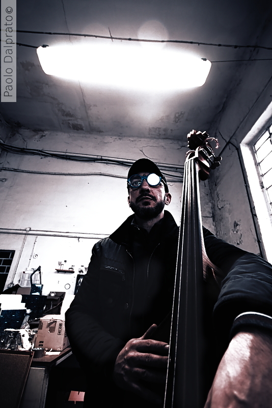 Sulla composizione, non è stata facile, forse ho voluto metterci troppe cose. Mi piaceva l'idea del musicista cyberpunk, idea che m'è arrivata dalle sue lenti che riflettevano molto la luce (mi sono appena ricordato di un suo ritratto in cui uso molto questa cosa, lo pubblico) e dall'ambiente, una fabbrica semiabbandonata usata per le prove. La ripresa dal basso è una vista che uso spesso, metti insieme tutto questo, almeno è quello che ho provato a fare. La mano ammetto d'averla proprio voluta tagliare,per aumentare il senso di deformazine del 10-20 sigma ai bordi, che (credo) fa sì che tutto quel braccio sembri non essere normale. Tutto pensato, più o meno, in frazioni di secondo, le prove erano finite ed i musicisti stavano scappando