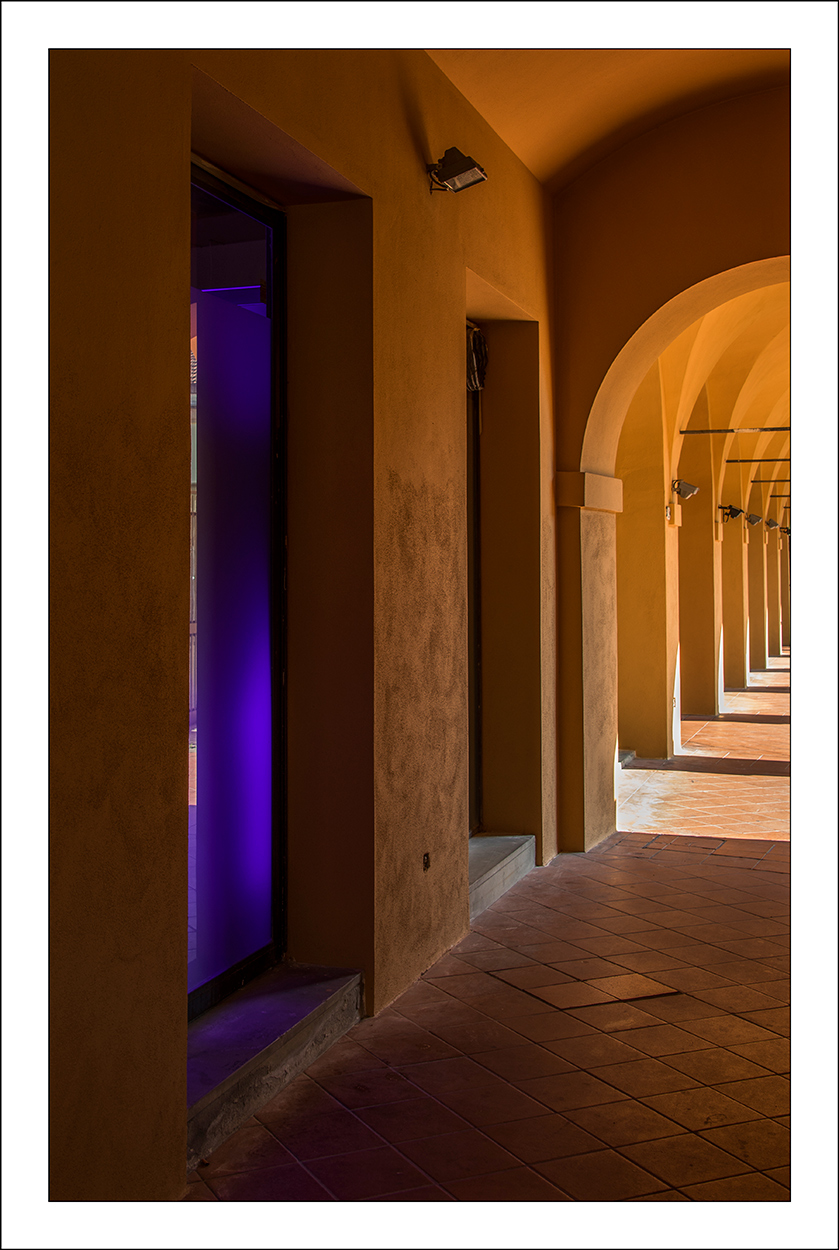 Intelligentemente scelto il tipo di costruzione compositiva, con il punto di inquadratura per il lungo corridoio, che condice ad una risultante di succssione di semiarcate, con la forma rettangolare, dell'ingresso in primo piano, che diviene protagonista , nella sua profondità materica e nella sua volumetria. La tinta arancio-ocra , satura e densa, che circonda il colpo di colore in blu-violetto, è molto bella.