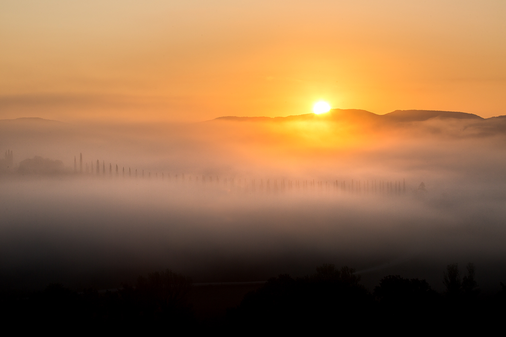 I colori caldi del sole nascente insieme alla foschia che sale dal terreno danno un fascino speciale a questo tuo scatto di un luogo super fotografato (è il doppio filare di cipressi di Poggio Covili?). Anche la parte scura in primo piano mi pare un' ottima scelta.
