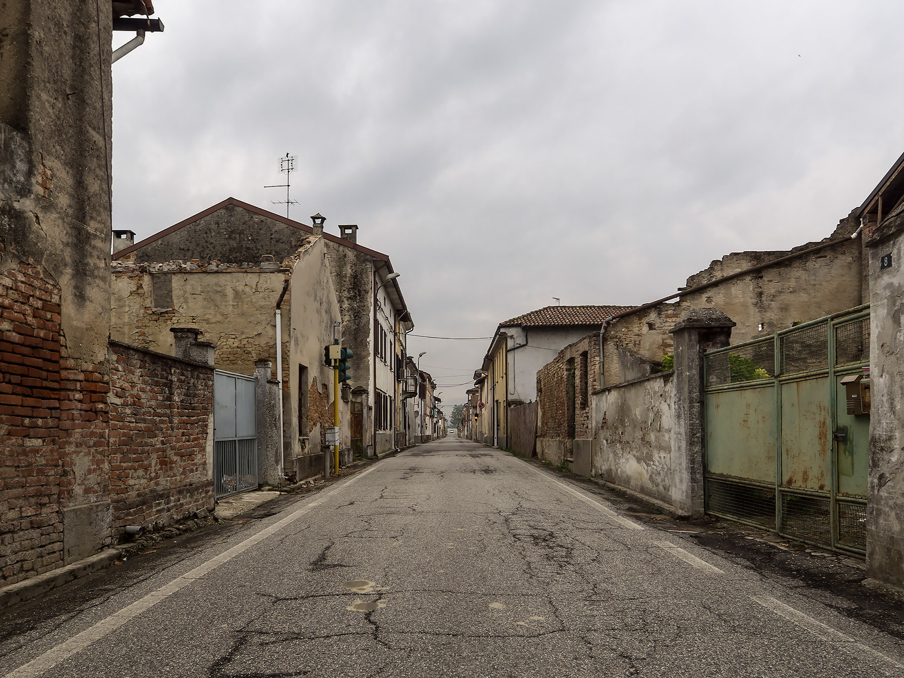 Se non fosse per la presenza dei semafori si direbbe che è un paese fantasma! Le case diroccate,il recente piovasco che avvalora le crepe della strada e il cielo grigio danno un'atmosfera malinconica allo scatto! Ciao