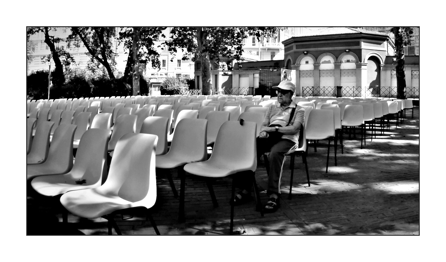 Unico spettatore, ampiamente in anticipo oppure ha sfruttato la seduta all'ombra per proteggersi dalla giornata calda d'estate.