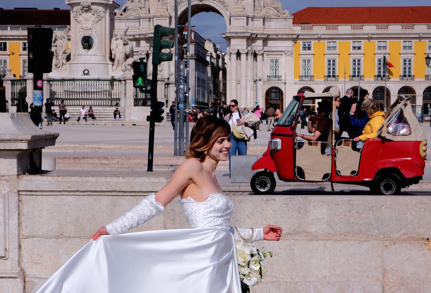 C'è tanta roba in questa foto. E' la famosa Praça do Comércio di Lisbona, ma a mio avviso o i particolari li metti interi e non li tagli, o li sfochi. Il semaforo con il contasecondi, l'ape rosso che porta in giro i turisti, non aggiungono nulla alla narrazione della storia di questa foto.