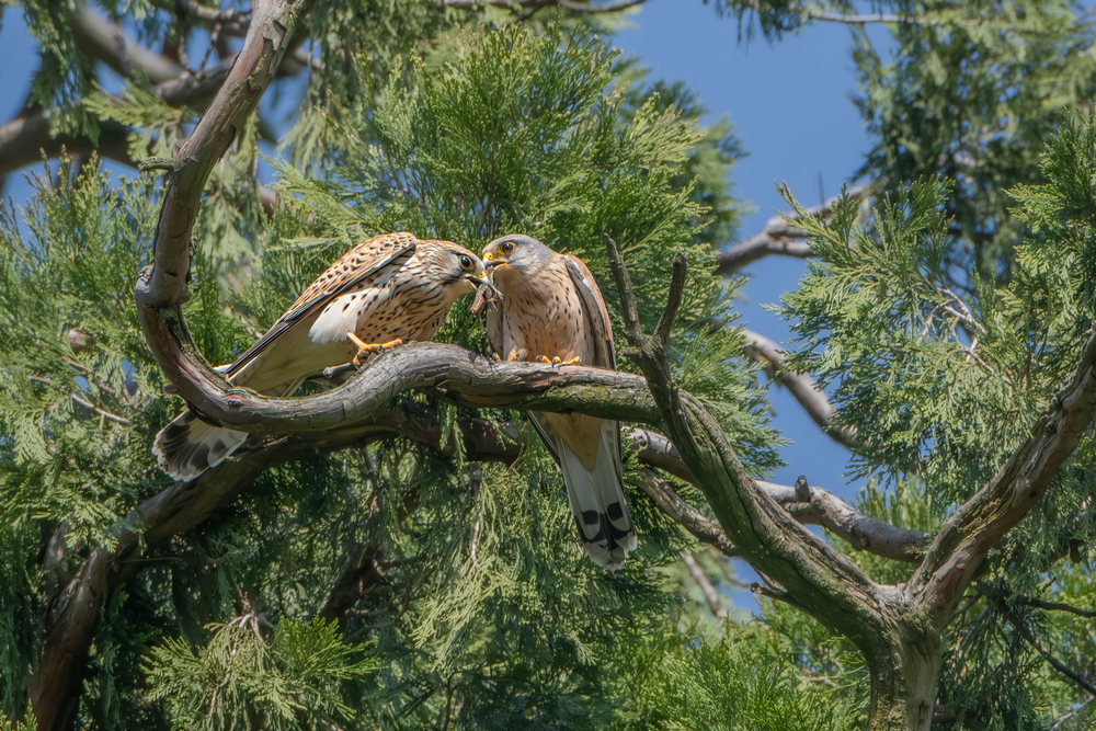 Interessantissima immagine, due gheppi, maschio e femmina si spartiscono la preda ....il maschio è quello a destra