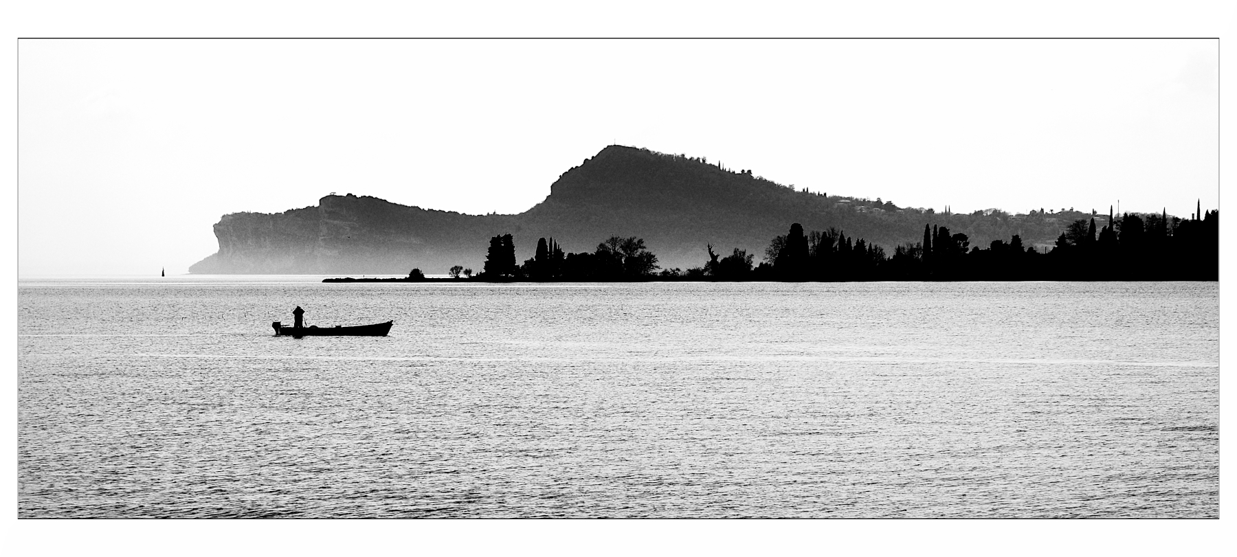 Durante la navigazione da Garda (VR) a Salò (BS): vista verso l'Isola di Garda e il promontorio di Manerba. Marzo 2025 _________________ Fotocamere Olympus OMD e PEN, Panasonic G3. Software GIMP