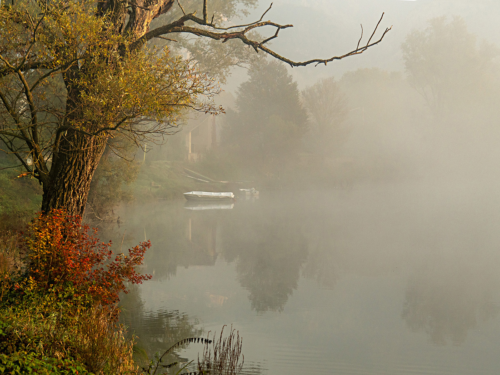 Ottima la scelta di composizione con l'albero ricco di colori autunnali che stacca sulla zona sfumata dalla nebbia. Hai colto una splendida atmosfera Ok! Ok! Ok!