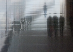 Trovo davvero raffinata l'interpretazione del tema offerta da questa immagine minimale, una metafora, non una metonimia. La città si sente: nell'anonimato delle figure umane, nella indistinzione nebbiosa, ma probabilmente vetrosa della texture, che ricorda i grandi spazi del lavoro d'ufficio, nelle linee uguali e monotone sulla sinistra che si intersecano con quelle orizzontali. Per me, bellissima.