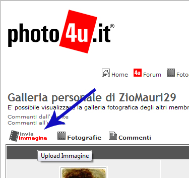 | La sezione reportage e portfolio richiede una qualche accortezza particolare per l'upload delle foto qui sul forum, in considerazione del fatto che, oltre alla prima normalmente caricata in galleria e messa ai commenti con la solita prassi, deve anche prevedere tutte quelle successive. Ma andiamo con ordine, considerando il tutto sin dall'inizio. Nella figura qui a lato, si può tranquillamente vedere come caricare una propria immagine nella galleria personale, basta cliccare su ''Invia immagine'', come indicato dalla freccia.