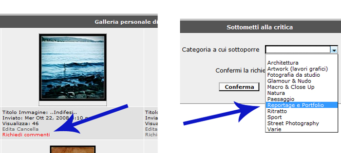 | Una volta caricato il file dell'immagine in galleria, l'immagine non è ancora postata nelle relative sezioni di critica, per cui serve ancora qualche passaggio intermedio. Come si vede dall'immagine qui a sinistra, è necessario cliccare su ''Richiedi commenti'', e nella schermata successiva, quindi, scegliere la sezione più adatta al tipo di immagine. Nel nostro caso, reportage e portfolio. | |